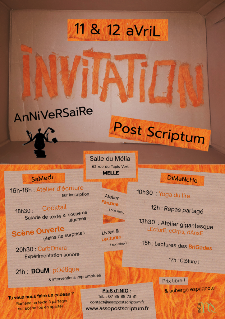 à l’occasion de l’évènement TOUS S’EN MÊLENT pour le 14 juillet à Melle (79), Post Scriptum et le Centre socioculturel proposent un cadre d’expression graphique et orale. La radio D4B a fait le montage, à écouter ci-dessous.